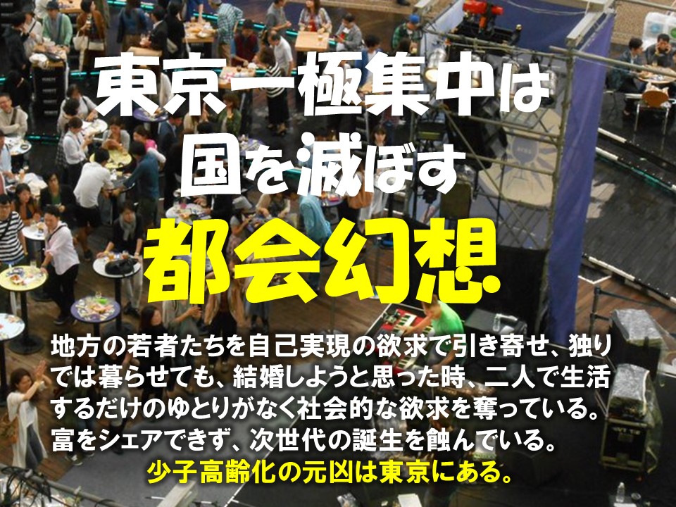 地方の若者たちを自己実現の欲求で引き寄せ、独りでは暮らせても、結婚しようと思ったら、家庭を持つだけの展望が見えず、社会的な欲求を奪っている。東京に集まって来る富を若者にシェアできず、次世代の誕生を蝕んでいる。少子化の元凶は東京にある。