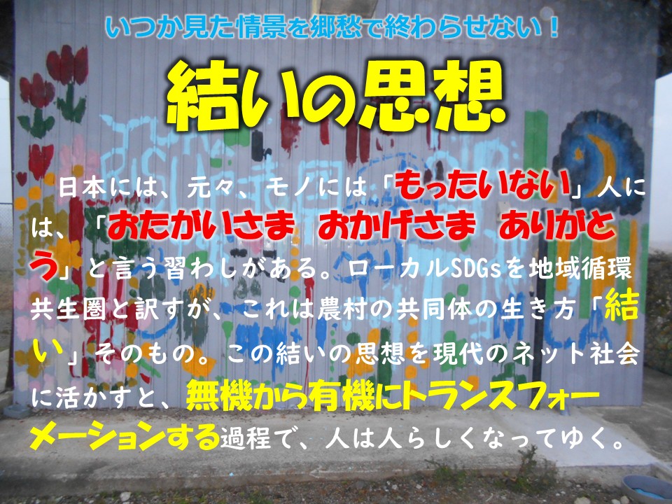 結いの思想日本には、元々、モノには「もったいない」人には、「おたがいさま おかげさま ありがとう」と言う習わしがある。ローカルSDGsを地域循環共生圏と訳すが、これは農村の共同体の生き方「結い」そのもの。この結いの思想を現代のネット社会に活かすと、無機から有機にトランスフォーメーションする過程で、人は人らしくなってゆく。