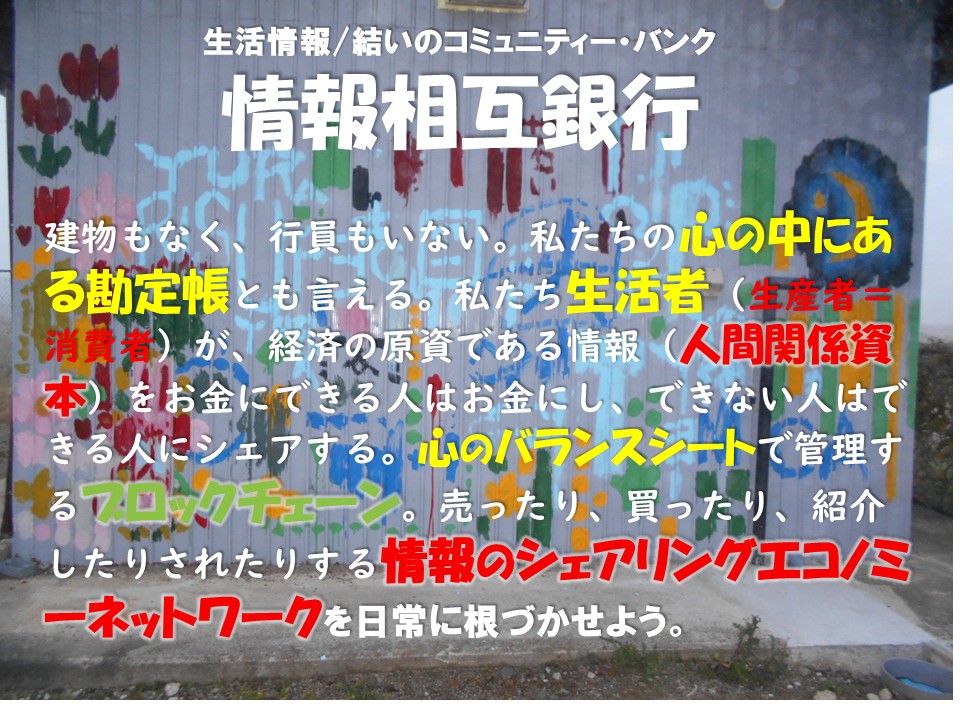情報相互銀行建物もなく、行員もいない。私たちの心の中にある勘定帳とも言える。私たち生活者(生産者=消費者)が、経済の原資である情報(人間関係資本)をお金にできる人はお金にし、できない人はできる人にシェアする。心のバランスシートで管理するブロックチェーン。売ったり、買ったり、紹介したりされたりする情報のシェアリングエコノミーネットワークを日常に根づかせよう。