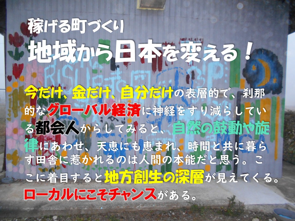 自社製品を自社販路で売る。これが企業の成長戦略です。同じことが自治体でも言えます。地域で産み出された物やサービスを、住民ネットワークで売る。この仕組みをつくる。これが、現状を打破する解決策です。ワーキングプアの食えないサラリーマンを増やすよりも、食える個人事業主を育てる方が未来に希望が持てます。そのためには、地域で産み出したモノやサービスを売り切る仕組みを住民の繋がりでつくる。事業のしやすい町にする。この事業共同体の芽生えが、ワクワク、ドキドキする町づくりにつながります。