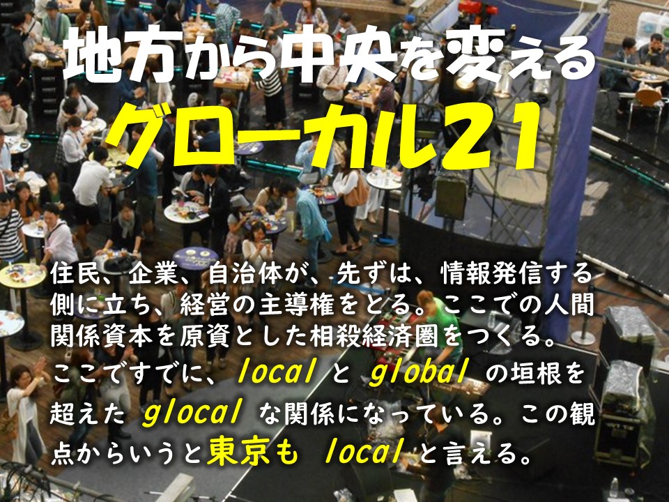 グローカル21 Glocal21住民、企業、自治体が先ずは、情報発信する側に立ち、経営の主導権をとる。ここでの人間関係資本を原資とした相殺経済圏をつくる。ここですでに、local と global の垣根を超えた glocal な関係になっている。この観点からいうと東京も local と言える。 「