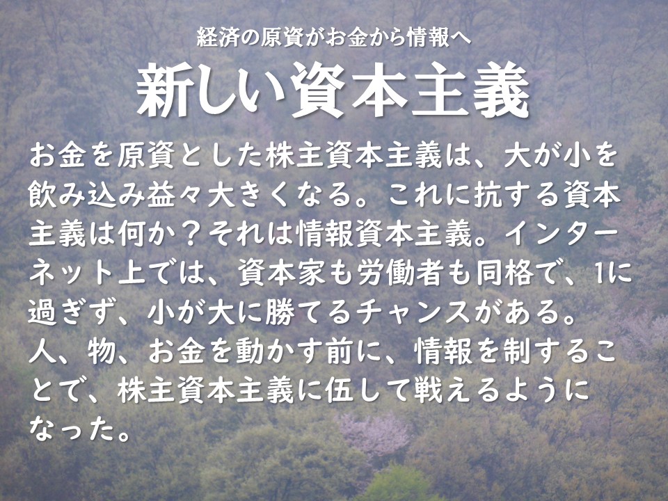 新しい資本主義 経済の原資は、お金から情報へ お金を原資とした株主資本主義は、大が小を飲み込み益々大きくなる。これに抗する資本主義は何か?それは情報資本主義を再定義することだ。私たち生活者は、生産者であり消費者でもある。ここでうまれる情報が経済の原資になる。資本家も労働者も同格であるインターネットで、シェアしたりされたりする仕組みをつくると、小が大に勝てるチャンスが生まれる。人、物、お金を動かす前に、主体者(私)は情報を制することで、株主資本主義に伍して戦えるようになる。誰もが資本家である生活者資本主義と言える。