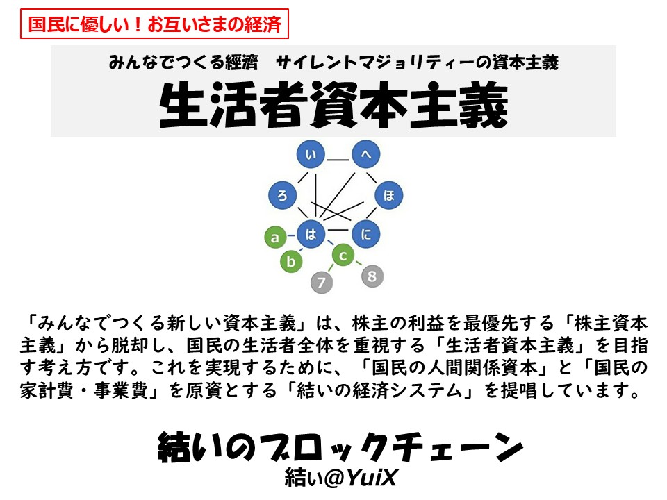 国民の人間関係資本と国民の家計費と事業費を原資とした結いの経済システム「みんなでつくる新しい資本主義」は、株主の利益を最優先する「株主資本主義」から脱却し、国民の生活者全体を重視する「生活者資本主義」を目指す考え方です。これを実現するために、「国民の人間関係資本」と「国民の家計費・事業費」を原資とする「結いの経済システム」を提唱しています。