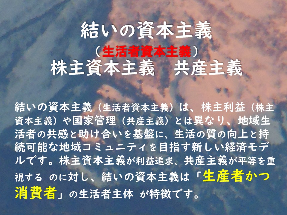 結いの資本主義(生活者資本主義)は、株主利益(株主資本主義)や国家管理(共産主義)とは異なり、地域生活者の共感と助け合いを基盤に、生活の質の向上と持続可能な地域コミュニティを目指す新しい経済モデルです。株主資本主義が利益追求、共産主義が平等を重視する のに対し、結いの資本主義は「生産者かつ消費者」の生活者主体 が特徴です。