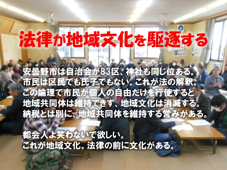私たちの暮らす安曇野市は、自治会が83区、神社も同じ位あります。しかし、市民はすべからく区民でもなく、氏子でもありません。これが法の解釈です。この論理で市民が個人の自由だけを過度に行使すると地域共同体は維持できなくなります。行政の運営にも支障をきたします。納税とは別に、地域住民としての役割があります。地域共同体を維持するための営みです。