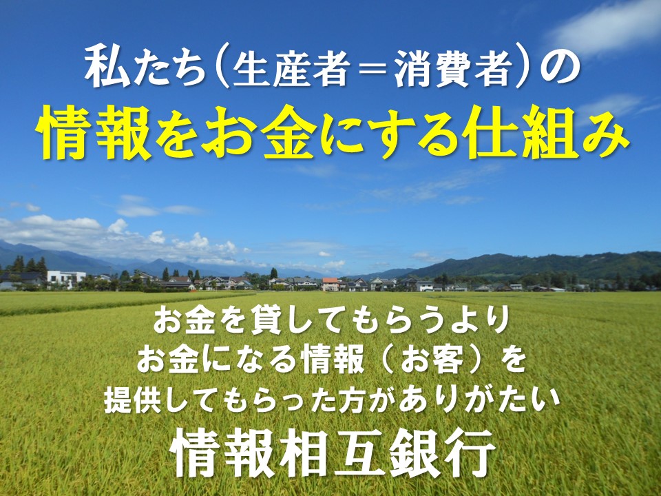 結いのコミュニティー・バンク実際の銀行を表と考えるとこの情報相互銀行は、建物もなく、行員もいない。私たちの心のなかにある裏の銀行と言える。私たちひとり一人が主体者となり、経済の原資である情報(人間関係資本)をお金にできる人はお金にし、できない人はできる人にシェアする。心のバランスシートで管理するブロックチェーンと言える。売ったり、買ったり、紹介したりされたりする情報交換ネットワーク。ここでいう情報とは、直接お金になったり、時間やお金の節約になる仕事や暮らしに役立つ原資をいう。