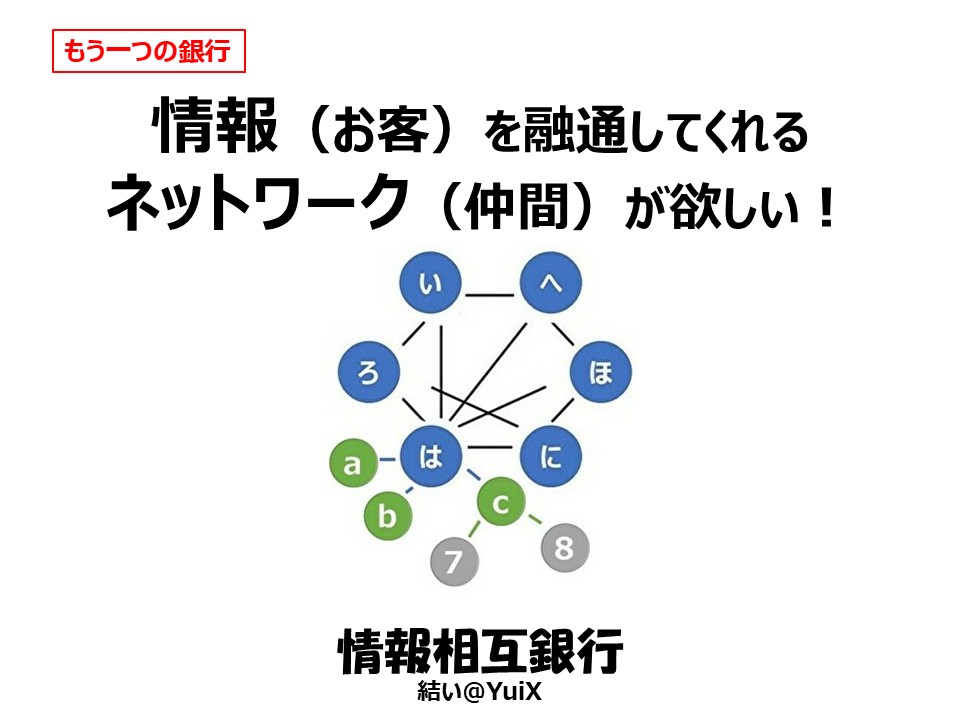 「結いの情報相互銀行」は、一般的な銀行業務(預金、貸付、為替など)を行う金融機関ではなく、情報シェアリングエコノミーのネットワークを指す名称と考えられます。これは、地域経済の活性化や地方創生を目的としたビジネスモデルの中で提唱されている構想であり、個人が持つ購買情報や人間関係資本といった「情報」を地域内で共有・活用し、新たな価値を生み出す仕組みを「情報相互銀行」と呼んでいます。 そのため、通常の銀行のような銀行コードや実店舗は存在しません。